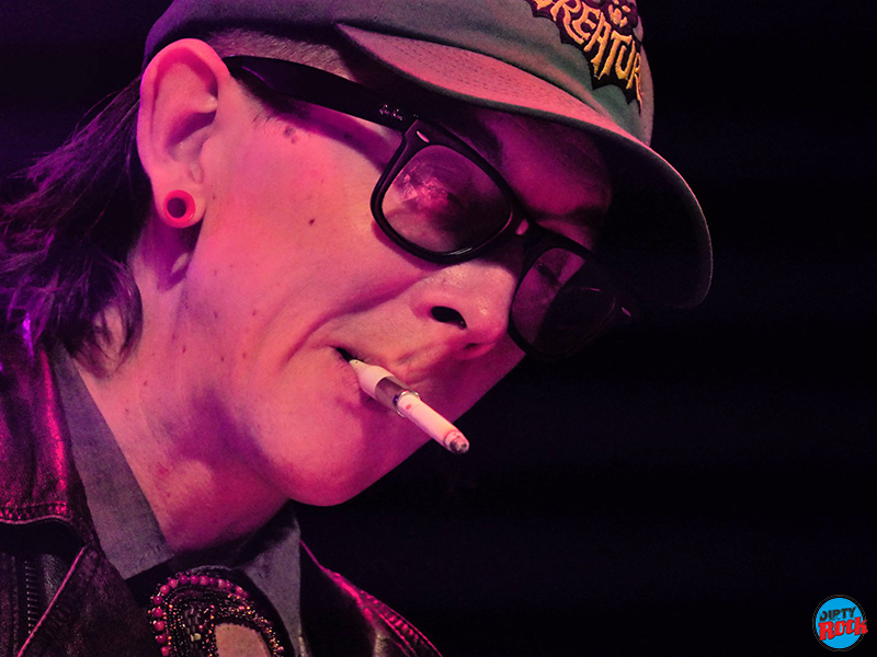 Tardó 20 minutos en aparecer respecto a la hora anunciada, colocó en una pequeña mesa, un brick de carrefour de zumo de manzana donde intuíamos se alojaba el bourbon, una cerveza y un paquete de cigarrillos. Salió fumando con boquilla. Prácticamente toda la noche la tuvo en la boca y cantó con ella dando un toque más chicloso a su voz ronca.