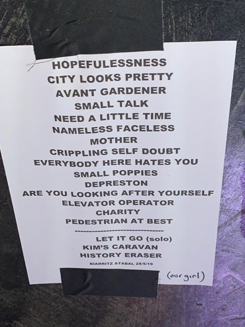 Para los bises, nuestra chica aparece en solitario para realizar una soberbia interpretación de Let It Go, el disco compartido con Kurt Vile. Destacable el silencio del público en este momento acústico. También ayuda el hecho de que el bar esté fuera del recinto propiamente dicho. Otro acierto en el diseño del Atabal, sin duda. Kim´s Caravan, momento para comprobar que, con su peculiar tocada sin púa, Courtney tiene pocos rivales a las seis cuerdas en el rock actual; e History Eraser cierran el concierto.