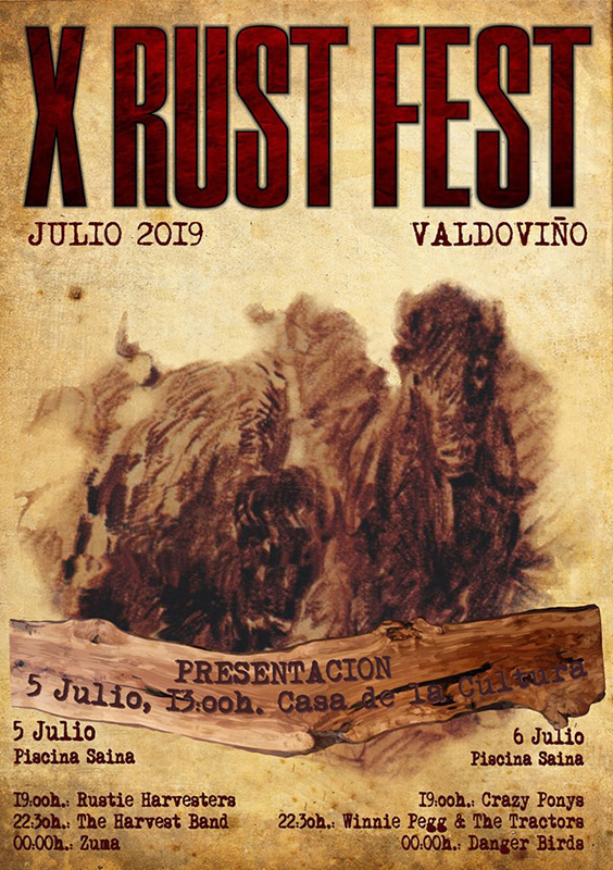 10ª edición del festival tributo a Neil Young llamado Rust Fest del 5 al 6 de julio en la piscina Saina en Valdoviño en Ferrol con las confirmaciones de Rustie Harvesters, The Harvest Band, Zuma, Crazy Ponys, Winnie Pegg & The Tractors y Danger Birds.
