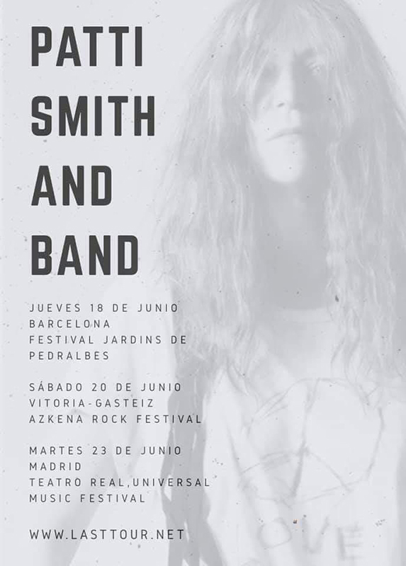 Patti Smith además de su concierto el 20 de junio en Vitoria en el Azkena Rock Festival, ofrecerá otros dos en nuestros país, el 18 de junio en Barcelona en el Festival Jardins Pedralbes y el 23 de junio en Madrid en el Teatro Real dentro de la programación del Universal Music Festival.