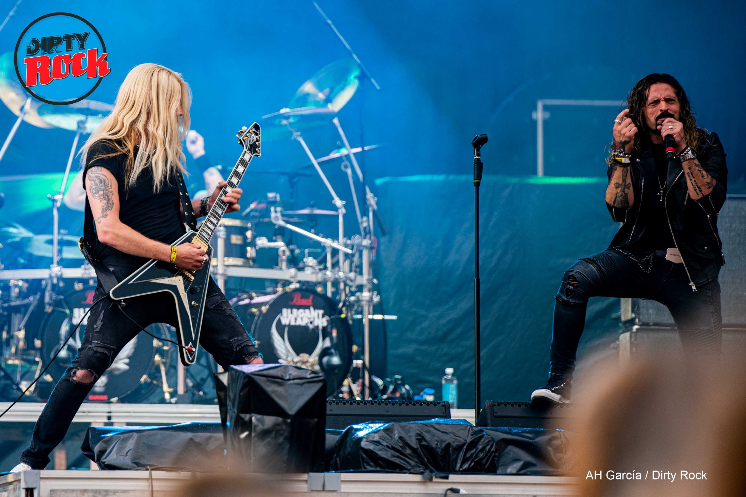 Era la hora de otra banda señalada en nuestra agenda, Elegant Weapons en el Main. A la guitarra Richie Faulkner, Christopher Williams a la batería, Dave Rimmer al bajo, y Ronnie Romero a la voz, ósea cachitos de Judas Priest, Accept, Uriah Heep, Lords of Black, Rainbow o MSG sobre las tablas. Vinieron a presentar su primer álbum “Horns For a Halo”, el tema homónimo cayó tercero tras un arranque potente con “Do or Die” y “Blind Leading the Blind”, Richie con su arsenal de hachas a su derecha nos taladró con sus riffs, el bajo Warwick Buzzard de Rimmer el mas bonito del festival es un maestro curtido en una y mil batallas. Ronnie dirigiéndose en castellano al público demostró una vez sus tablas, sonaron ocho de los diez temas del album, una pena “Lights Out” se quedara fuera, es muy Rainbow, aún así la bandera del heavy metal ondeo bien alta en Viveiro, no fallan estos ilustres. “Dirty Pig” es un gran tema, en “Downfall Rising” se lucieron todos, tras “Bitter Pill” llegó el riff y las sirena de “War Pigs” las palmas y los vítores unánimes y un fin de bolo magistral, elegantes, satisfechos de lo visto y de lo que venia aún.