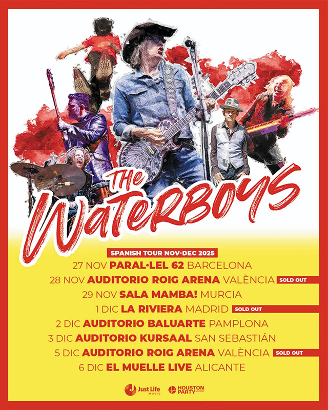 Esas paradas españolas de The Waterboys serán el 27 de noviembre, Barcelona (Paral.lel 62); el 28, València (Roig Arena); el 29, Murcia (Sala Mamba!); el 1 de diciembre, Madrid (La Riviera); el 2, Pamplona (Auditorio Baluarte), 3 de diciembre en Donosti (Kursaal), 5 diciembre en València (Roig Arena) y el 6 de diciembre en Alicante (El Muelle Live).