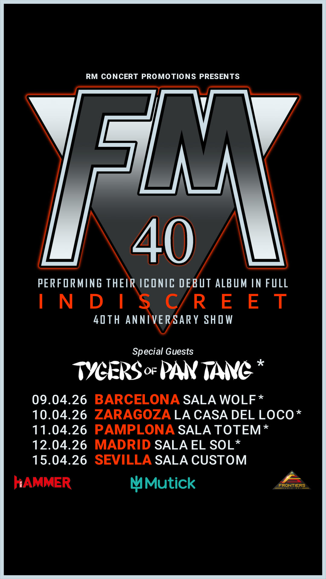 FM junto a Tygers Of Pan Tang estarán visitando nuestro país durante cuatro fechas en el mes de Abril de 2026 y se suma una más sin compartir escenario con los segundos. Dos legendarias formaciones británicas que se resisten a claudicar con el paso del tiempo. FM sigue siendo efigie del hard rock melódico y lo celebran interpretando su icónico trabajo “Indiscreet” que cumple cuatro décadas. Su discografía, sobre todo sus primeros discos, han sido influyentes para otras bandas. El gusto por crear melodías y la capacidad de hacer rock elegante es parte de la idiosincrasia de esta formación. La ilustre formación, además de repasar aquel primer trabajo que les colocó en lo más alto, presentará temas de lo que será su esperado nuevo trabajo “Brotherhood” que saldrá oficialmente el 5 de Septiembre.