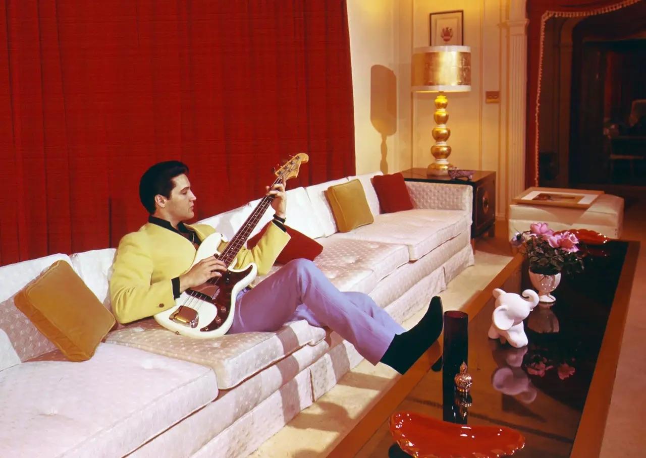 Elvis estaba al fondo de una sala grande, no salió a recibirles a la puerta (versión que difiere de la de Ringo, que recuerda que Elvis sí lo hizo) viendo un enorme televisor con el sonido apagado, sentado en un sillón y tocando un bajo Fender conectado a un amplificador gigante. McCartney recuerda que tenía puesto Mohair Sam de Chalie Rich, y la ponía una y otra vez sin parar, era uno de los singles del momento, y para Paul, era un síntoma de que Elvis estaba al tanto de la música tal y como hacían ellos.