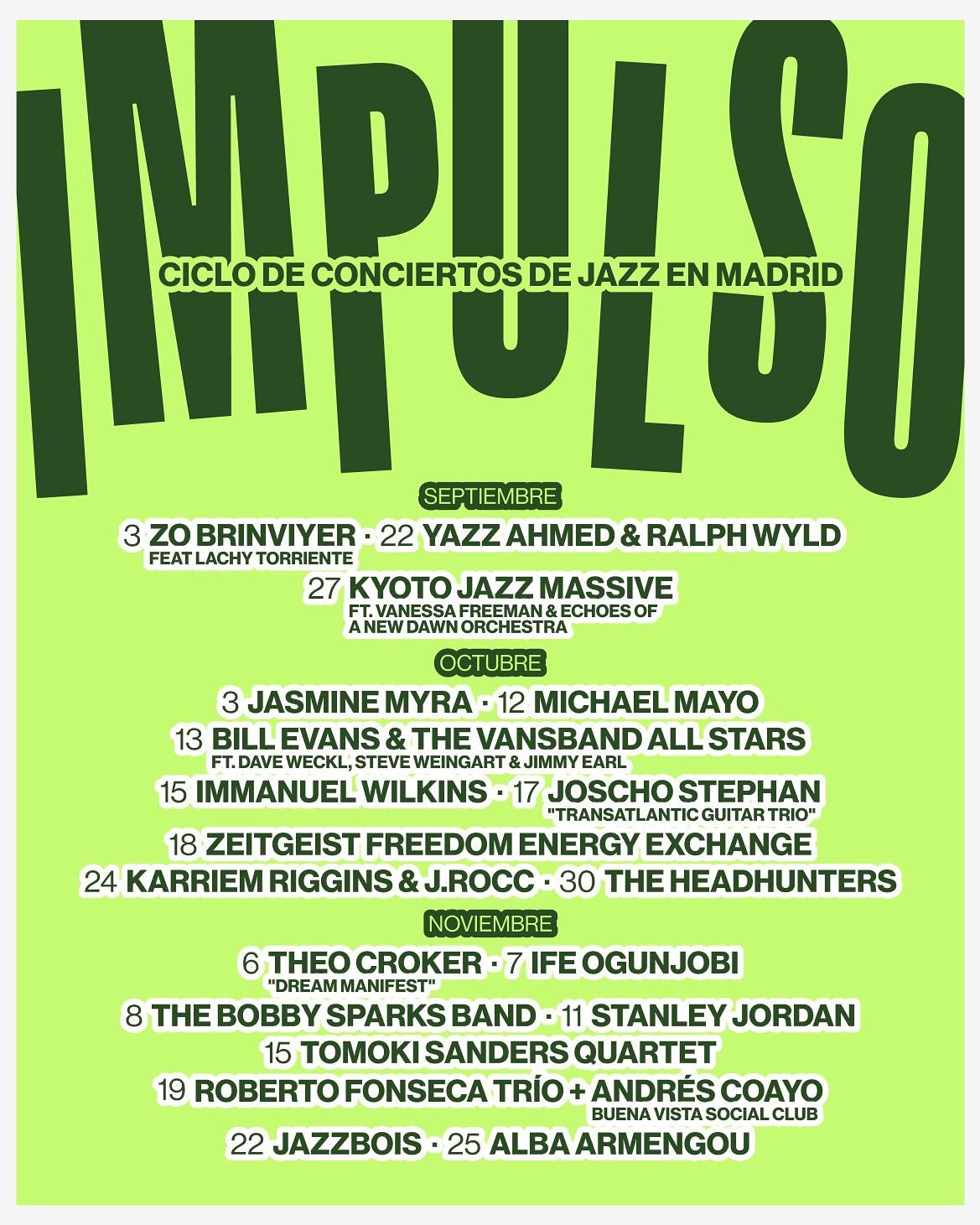 Impulso nace con la idea de propulsar el jazz en Madrid durante los meses de Septiembre, Octubre y Noviembre. Una propuesta creativa organizado por Cultura Inquieta donde la música es el epicentro ofreciendo una suculenta oferta. Artistas de primera línea componen un cartel capaz de congeniar tradición y nuevas tendencias. El hilo musical en Madrid durante este otoño es el jazz en vivo.