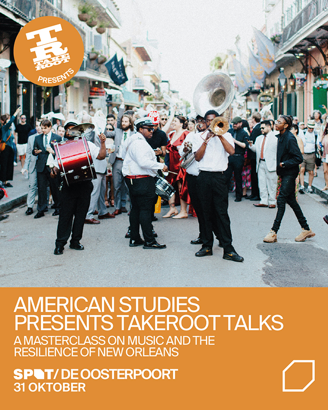 Además el festival ha creado un ciclo de conferencias llamado Charlas TakeRoot. Una clase magistral especial llena de historias, música y nuevas perspectivas, organizada por Estudios Americanos (Universidad de Groningen) y el Festival TakeRoot el 31 de octubre sobre la rica historia de Nueva Orleans en The Oosterpoort en el Salón Interior a partir de las 17 horas. Una ciudad de resiliencia, cultura y creatividad, moldeada por un gran sufrimiento personal y colectivo, como el huracán Katrina. Además de una conferencia y una mesa redonda dirigida por Laila Frank, Gill Landry se encargará de la animación musical.