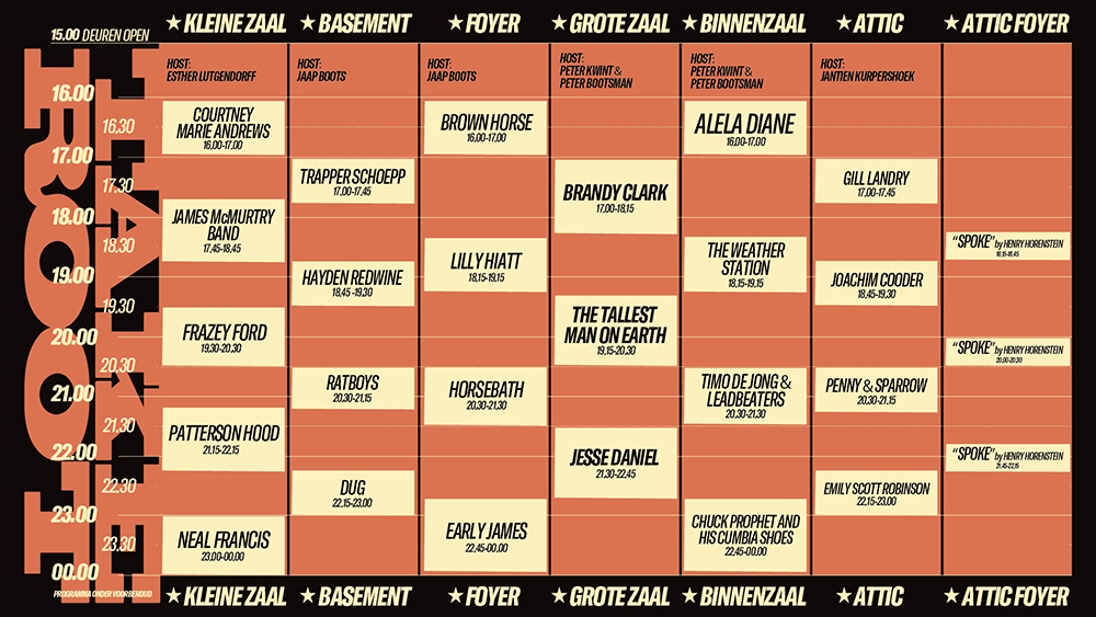 Timo de Jong, y la banda de cuerdas desde Ámsterdam, Leadbeaters, estaban destinados para tocar en el TakeRoot. De Jong lleva años activo como cantautor y se ha consolidado como una de las voces más interesantes de la escena roots neerlandesa. Su cálida voz de barítono, según muchos, evoca recuerdos de cantantes como Glen Campbell y Frank Sinatra, mientras que sus canciones mantienen una firme conexión con el folk y el country. Las historias que narra son personales, a menudo con un toque de melancolía, pero siempre con un toque de humor.