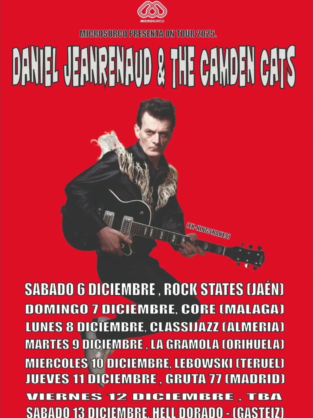 Si eres de los que añora el rock and roll auténtico, sin abalorios, estás de enhorabuena porque en Diciembre nos visita Daniel Jeanrenaud & The Camden Cats. El que fuese fundador, guitarrista y cantante de The Kingsnakes se presenta en nuestros escenarios en formato trío acompañado por Jean Marc al bajo y Nicky Forbes a la batería. Es posible que en nuestros días se cuenten con los dedos de una mano, posiblemente sobre alguno, artistas tan auténticos y poco valorados como Daniel Jeanrenaud. Estamos ante una leyenda del rock and roll, a principios de la década de los ochenta Daniel fundó The Kingsnakes, que junto a otras formaciones hicieron resurgir la escena del blues rock.