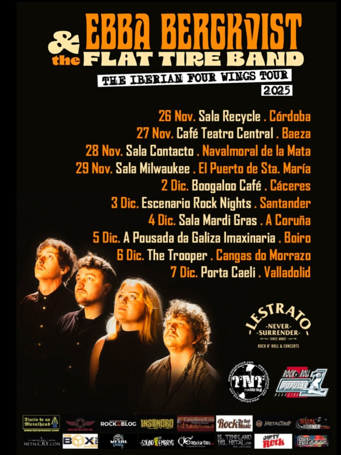 Ebba Bergkvist & The Flat Tire Band estarán en nuestro país a finales del mes presente e inaugurando el próximo, consolidando su estatus de banda próspera en el panorama del rock actual. Originarios de Suecia se presentan con sus dos trabajos como una de las formaciones más potentes de blues rock europeo. Su música contemporánea ha logrado una conexión con los sonidos de los setenta, estímulos que han dado rienda suelta para ajustarlos en un decisivo rock atemporal.