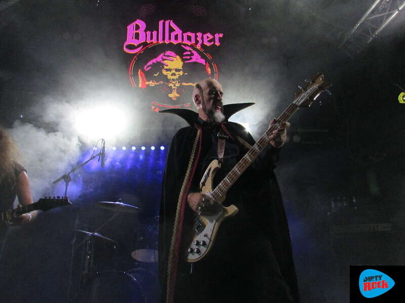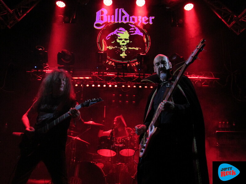 La batería sostuvo un ritmo feroz mientras las voces agudas y desgarradas se fundían con la instrumentación. Entre sudor, oscuridad e introspección, la banda combinó agresividad extrema con momentos melódicos que rompían brevemente la violencia sonora. Con estructuras poco convencionales y temáticas nihilistas, Los Males Del Mundo plasmaron un black metal auténtico y devastador interpretando los cinco temas componen el EP ya citado y dejar paso a los legendarios Bulldozer. El trío italiano venían celebrando el cuarenta aniversario de su disco debut “The Day Of Wrath”, A.C. Wild (bajo y voz) junto a Andy Panigada (guitarra) supervivientes de la formación original, continúan liderando este exorcismo musical que desde los ochenta combina crudeza, velocidad y un aura maligna muy propia de la primera ola del black-speed metal. Les acompaña a las baquetas Emanuelle “Manu” Collato, cuya pegada sólida y agresiva convirtió la batería en una auténtica apisonadora.