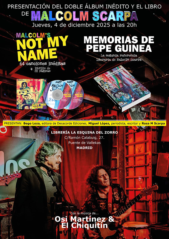 La librería, bajo los remos y timón de Bego y Jorge, ofrece cantidad y calidad de libros musicales, entre ellos los que editan ellos mismos bajo el sello Desacorde que ahora acoge está obra de Malcolm. El disco Malcolm’s Not My Name (se lo preguntaban mucho a Juan Manuel) resulta exhuberante en sus dos partes, con la extrema variedad que siempre ha caracterizado a sus composiciones y un humor salpicado de champagne, costumbrismo y visión única sobre lo cotidiano.