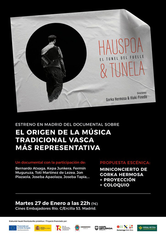 Además de la proyección, en la presentación en Madrid de “El Túnel del Fuelle”, Gorka Hermosa ofreció un mini concierto con tres piezas de enorme calidad (una de ellas dedicada a sus dos hijas). En el posterior coloquio se sumó el actor y cantante Jimmy Barnatán, quien narró sus propias experiencias con la trikitixa.