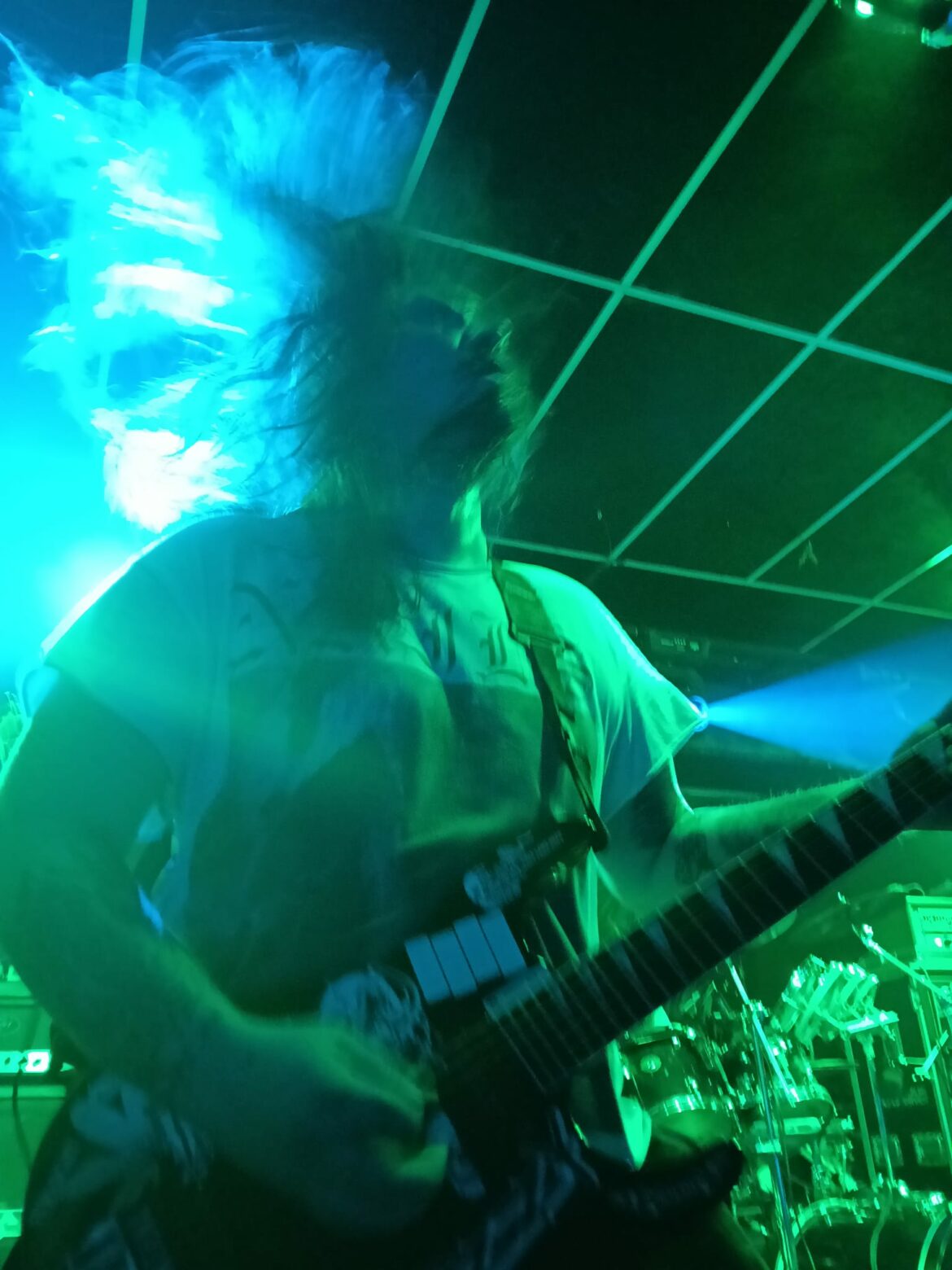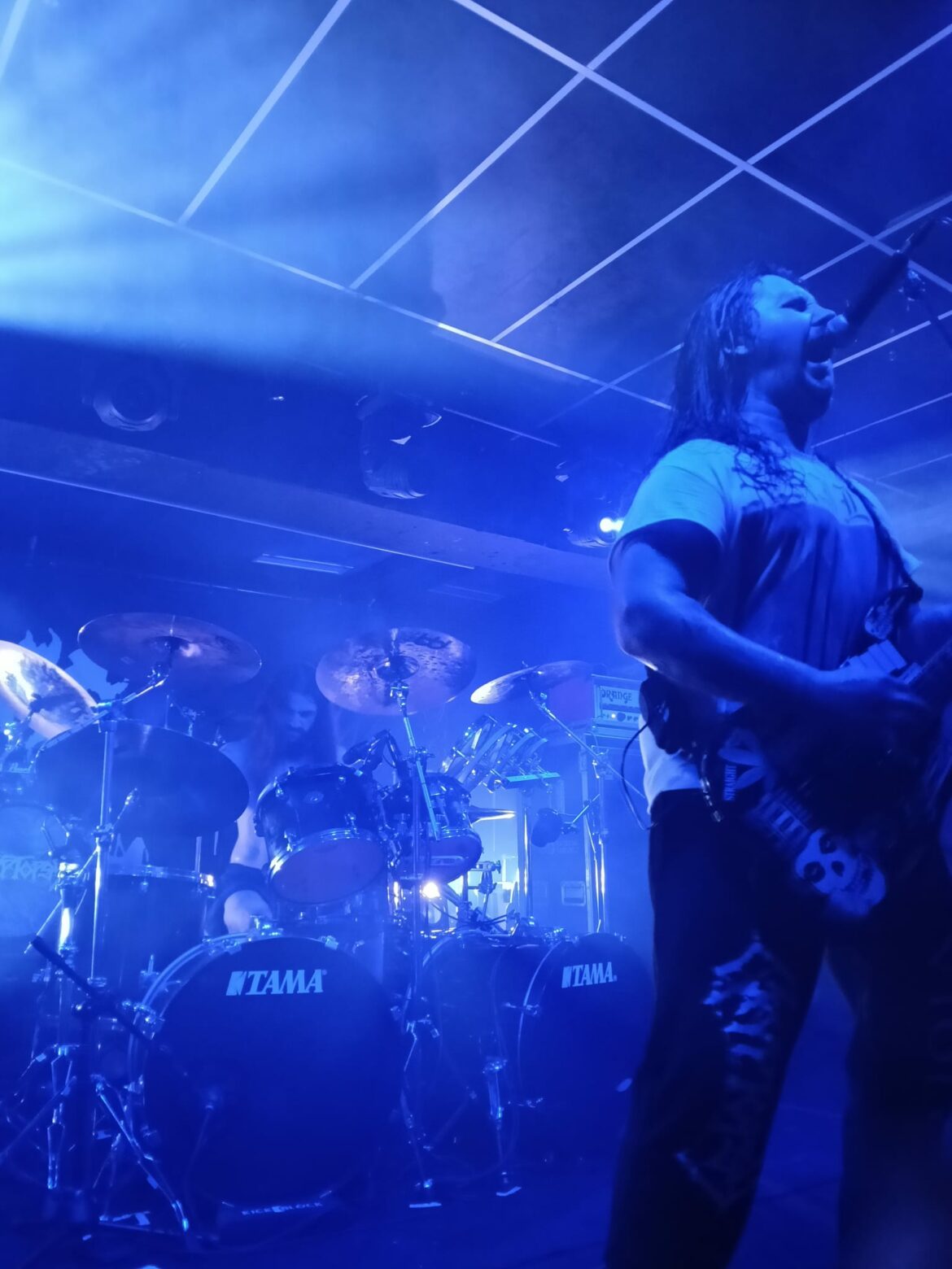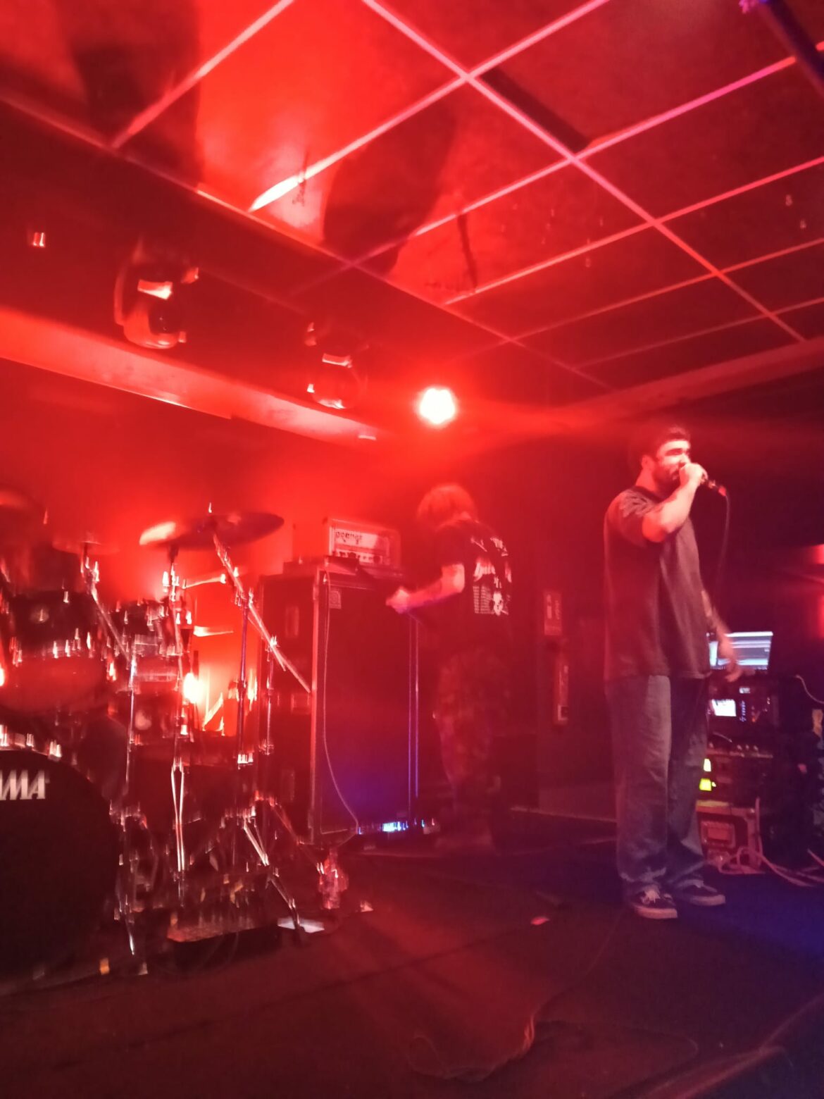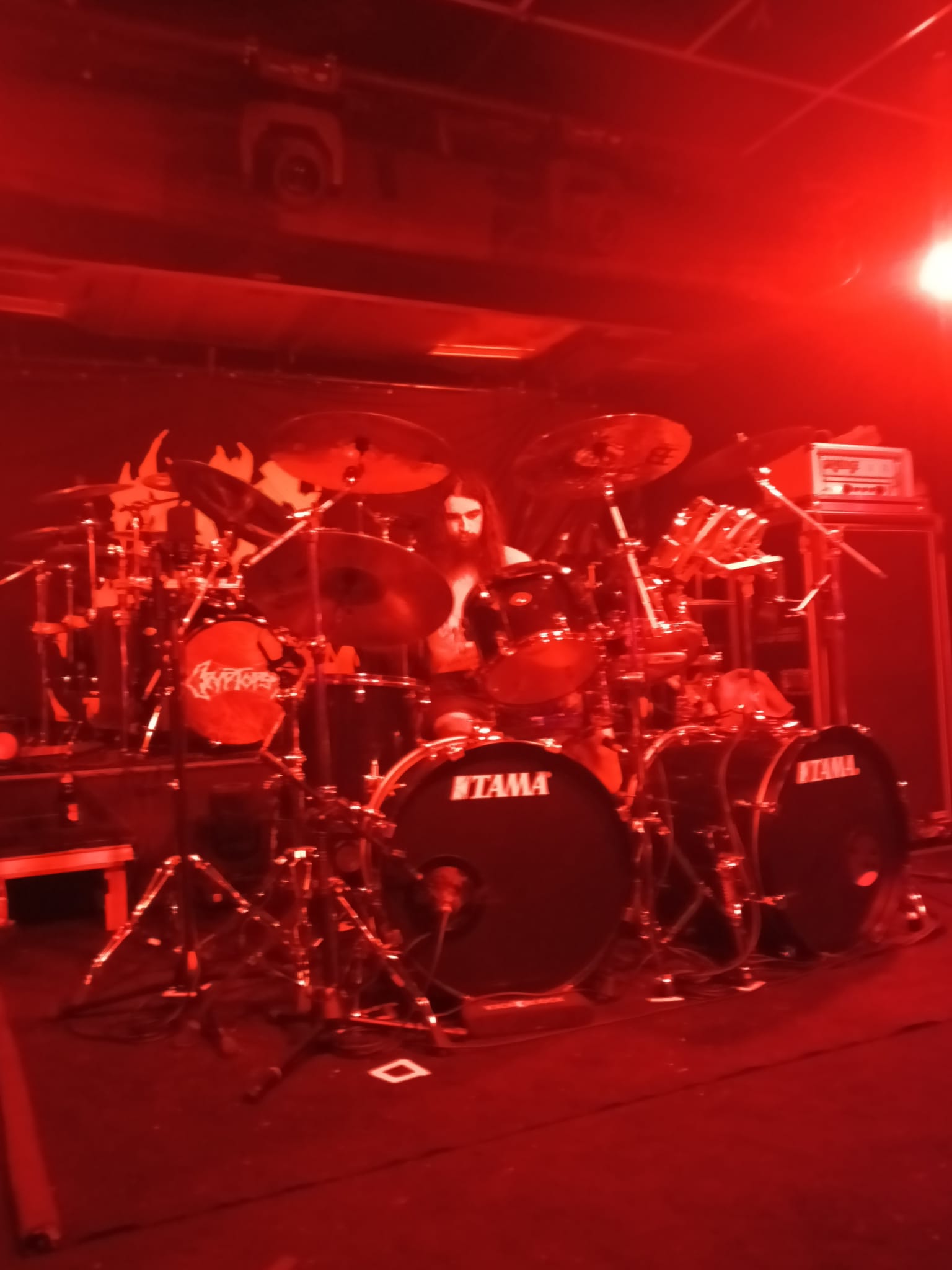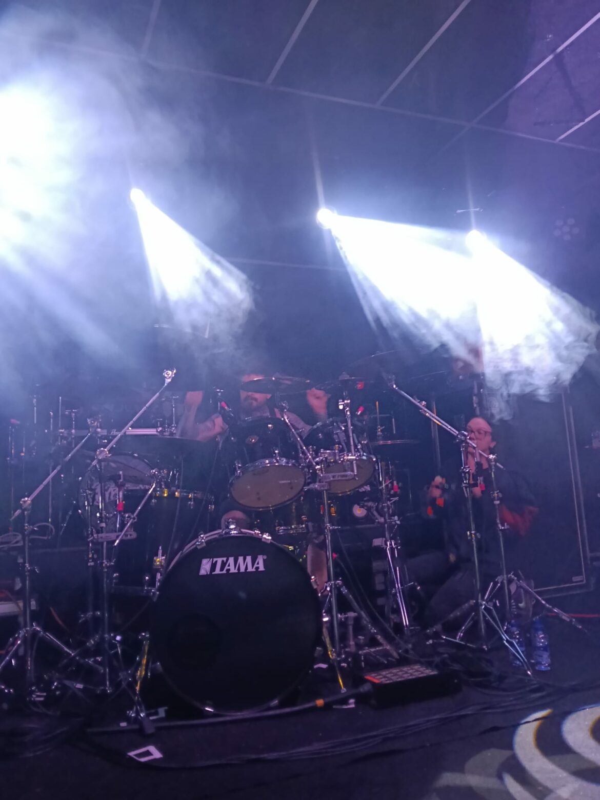 En el fondo de la sala, la descomunal batería de Flo Mounier está preparada para recibir el buen hacer del maestro que en breve va a desplegar un excelente festival de doble bombo con blast beat de excelencia.