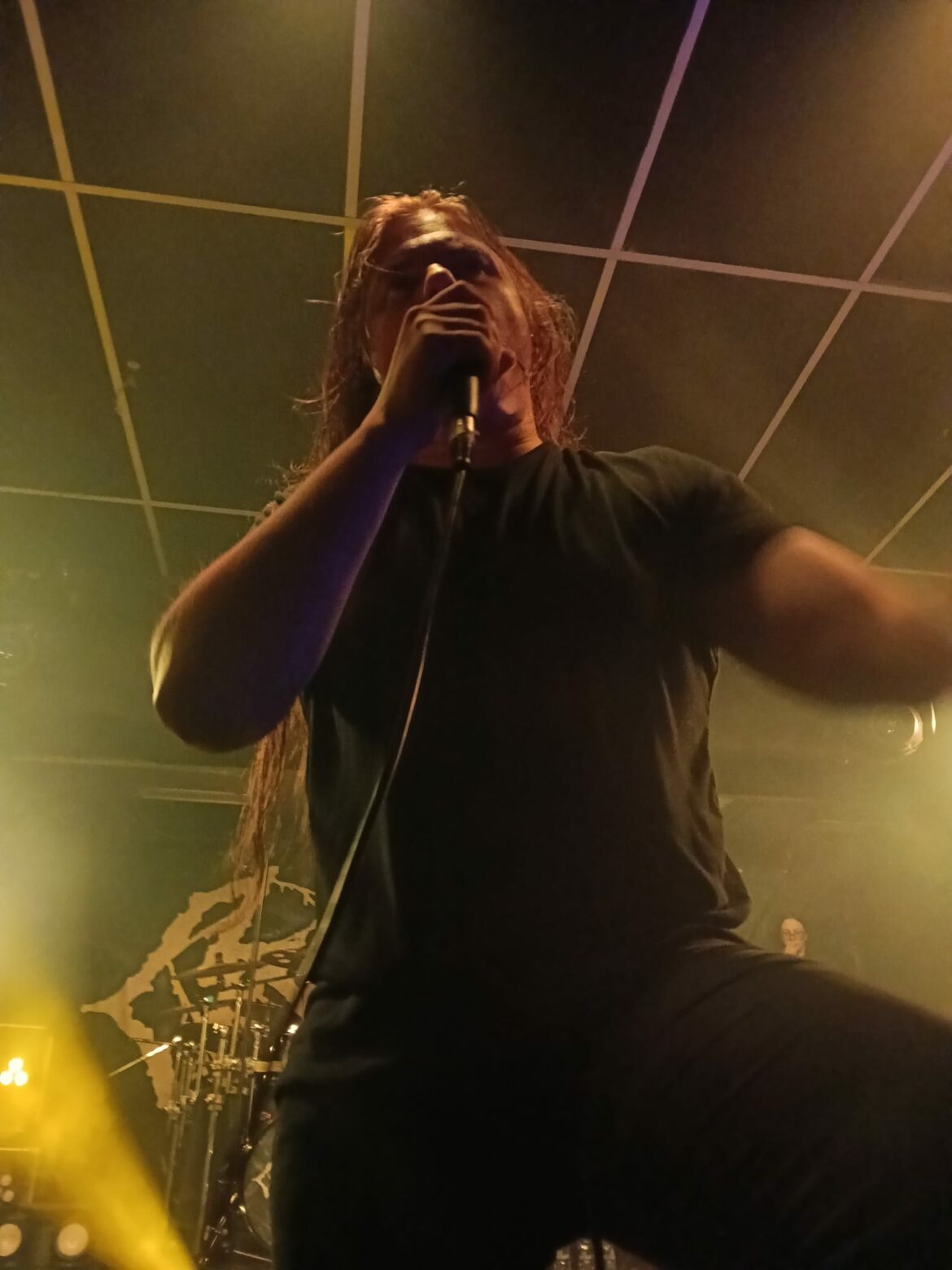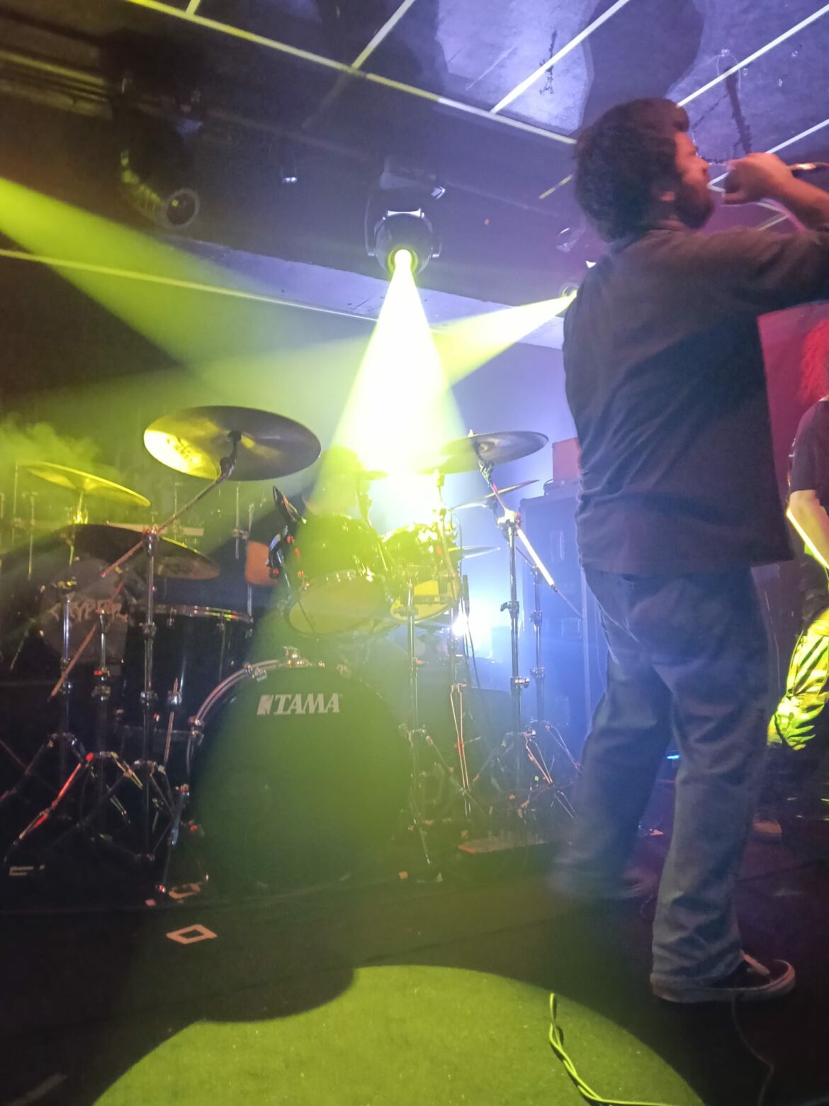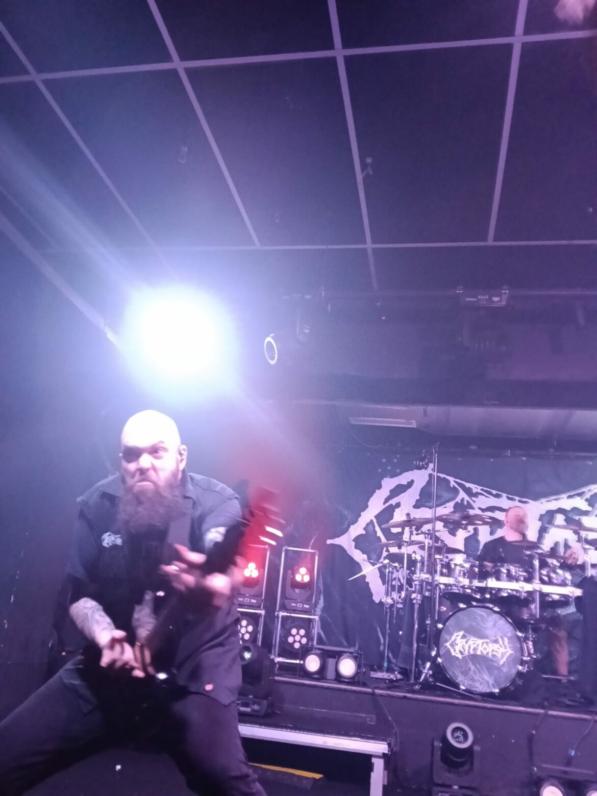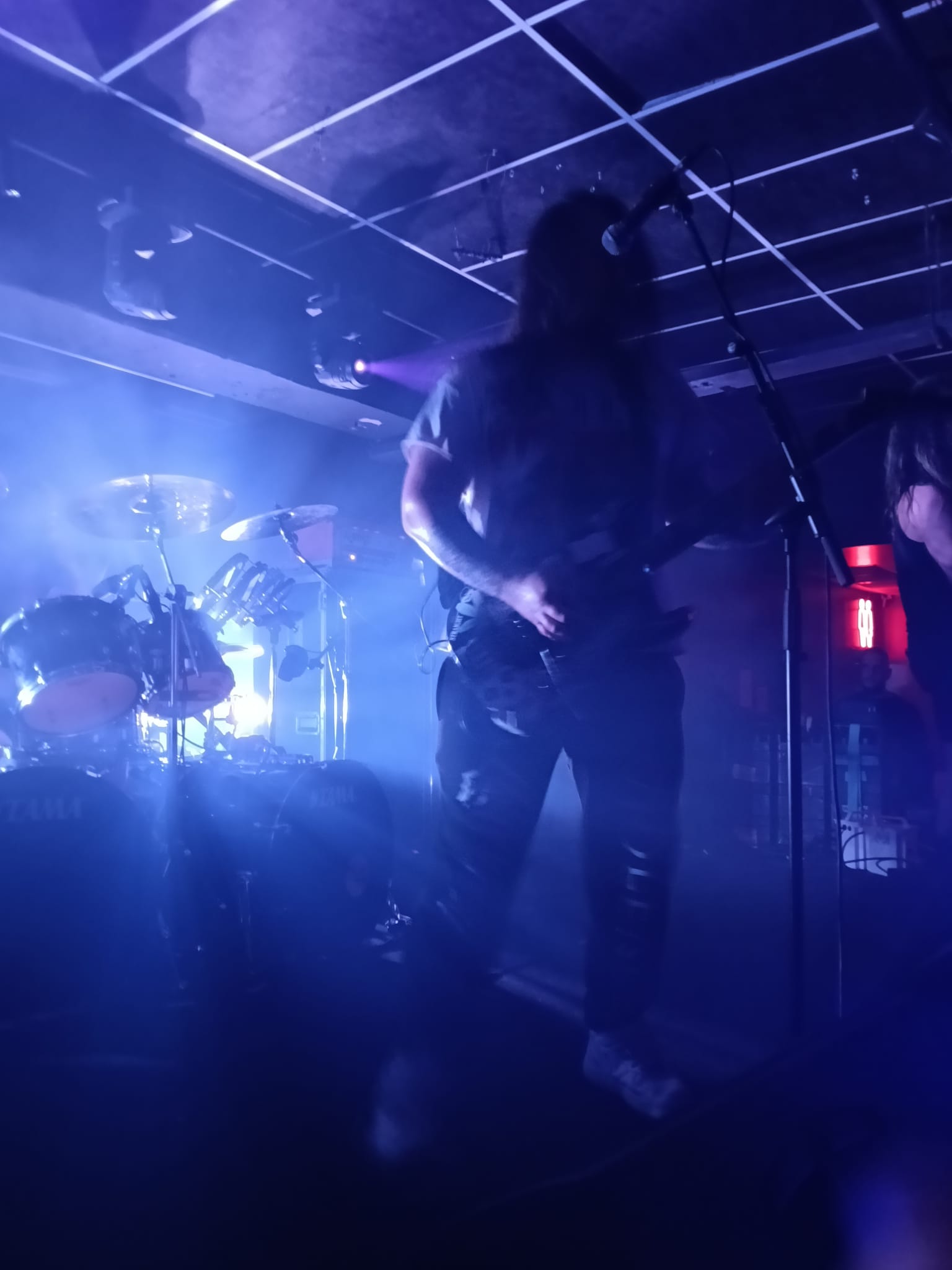 En el fondo de la sala, la descomunal batería de Flo Mounier está preparada para recibir el buen hacer del maestro que en breve va a desplegar un excelente festival de doble bombo con blast beat de excelencia.