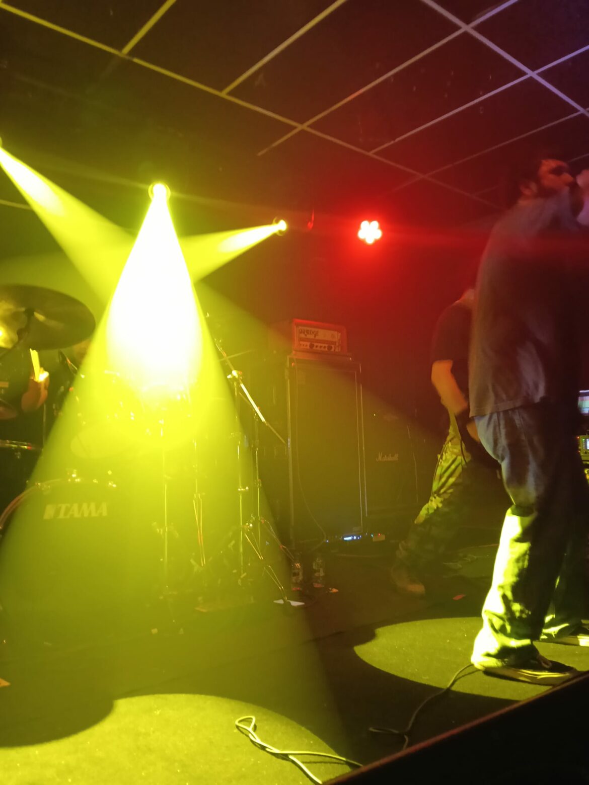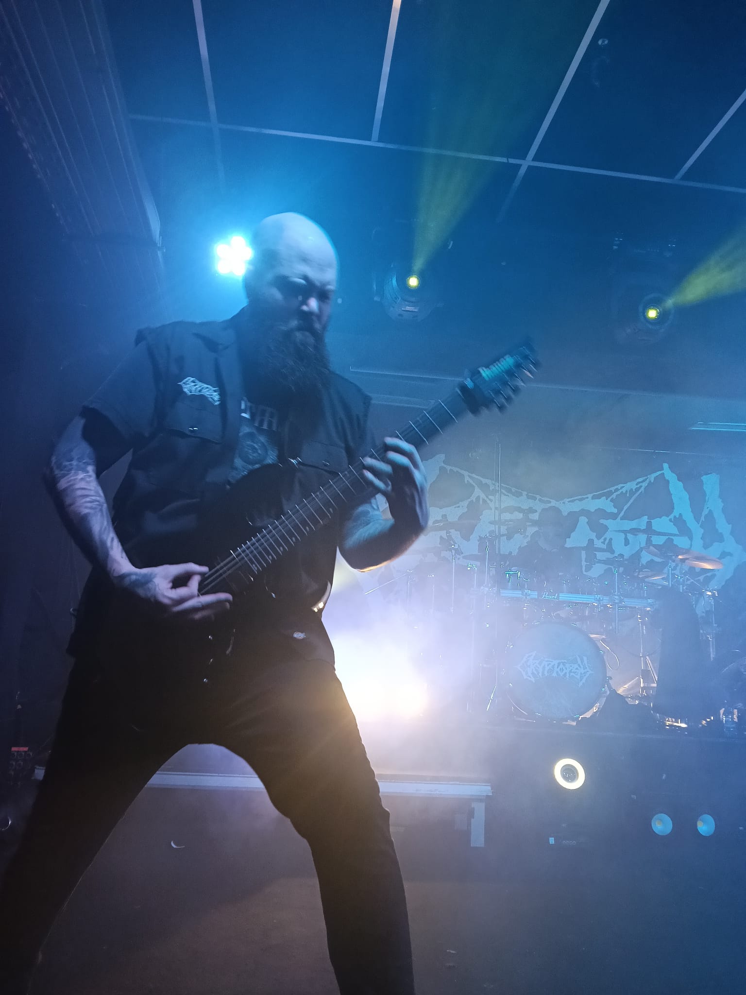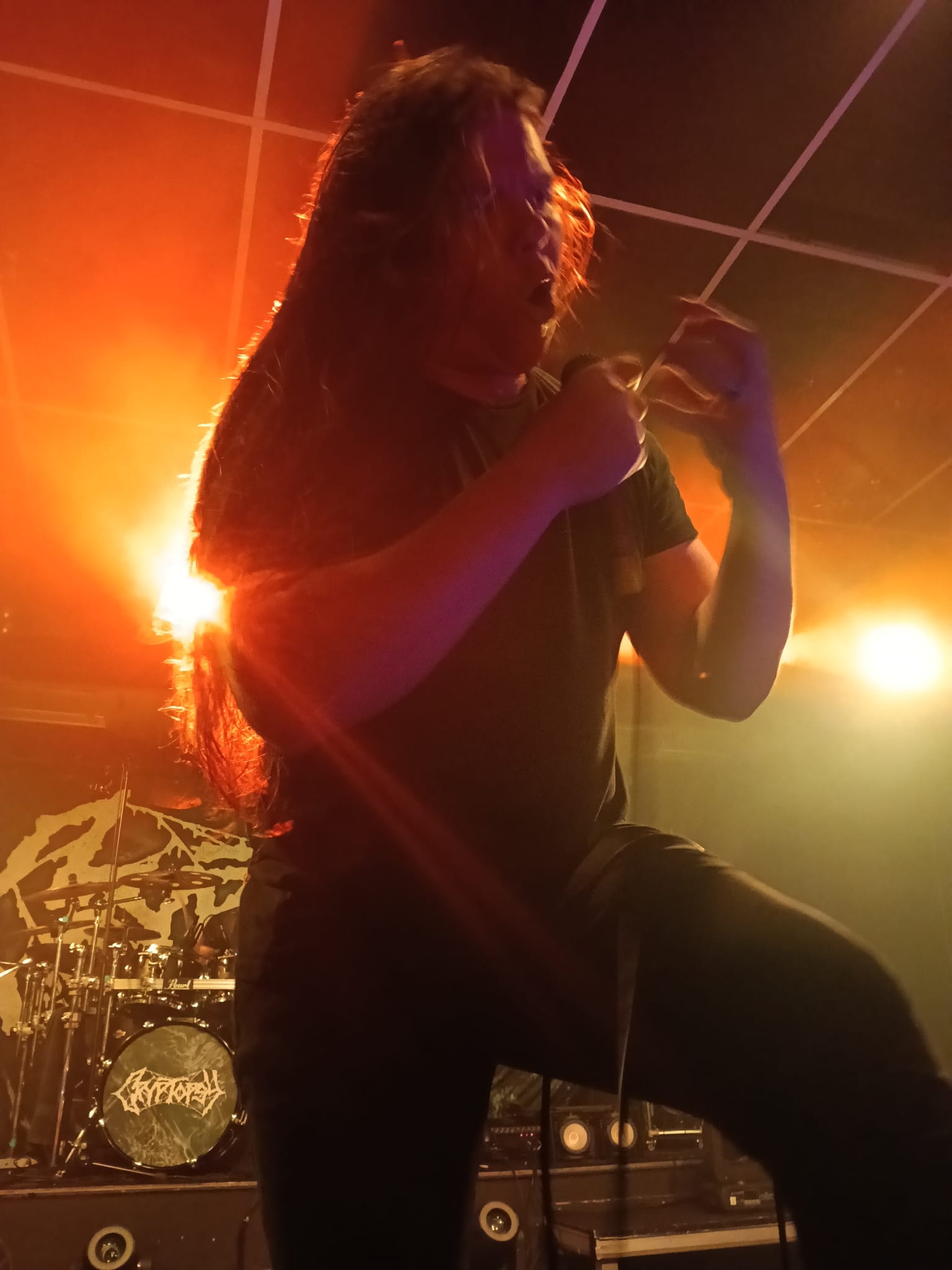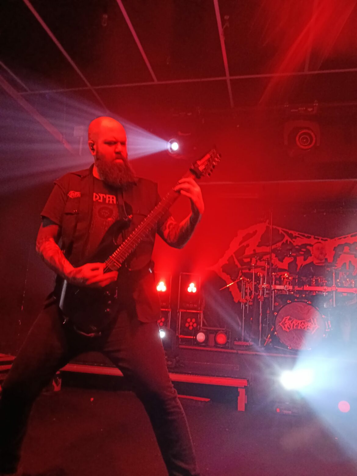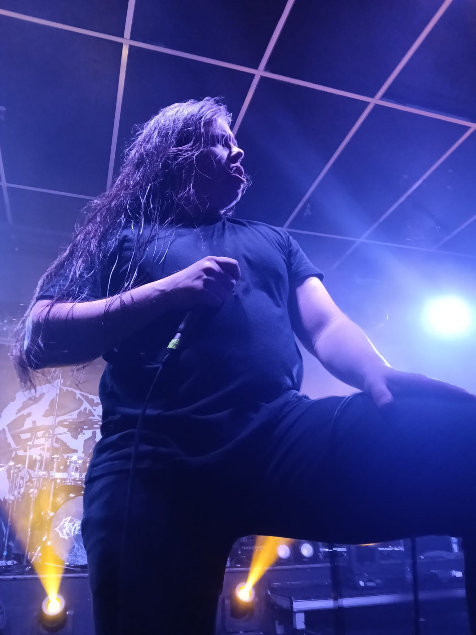 En el fondo de la sala, la descomunal batería de Flo Mounier está preparada para recibir el buen hacer del maestro que en breve va a desplegar un excelente festival de doble bombo con blast beat de excelencia.
