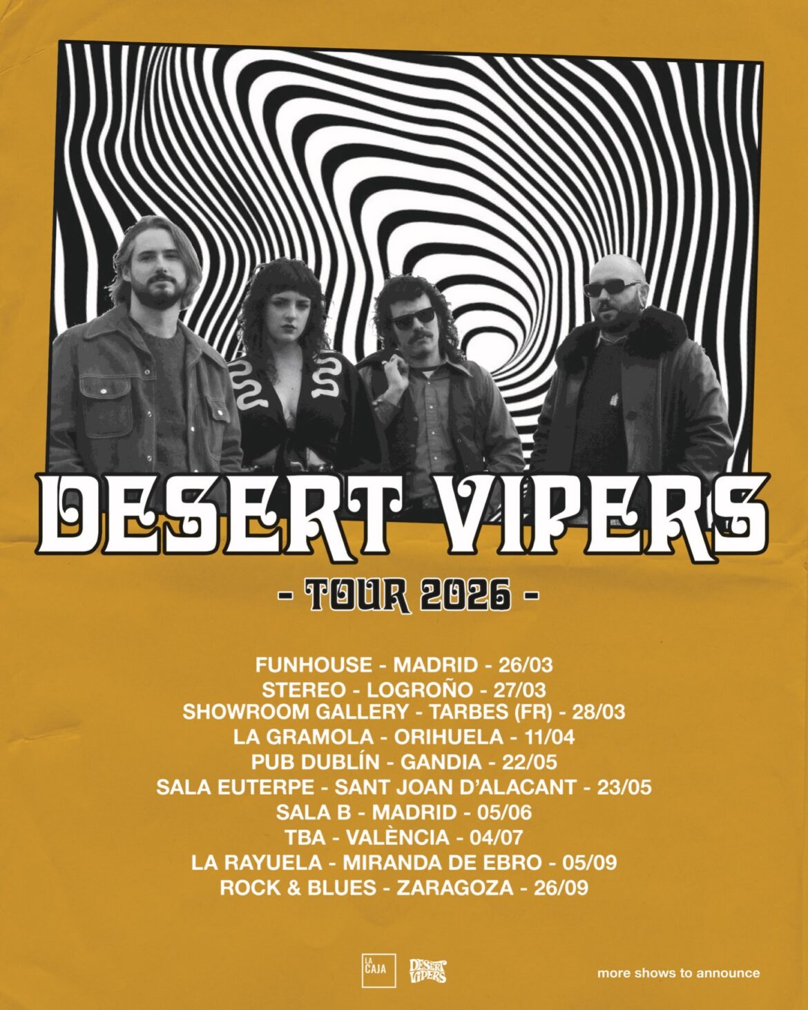 Hay ecos de décadas donde el “paz y amor” convivía con la distorsión. Un rock bohemio y setentero que mezcla improvisación, estructuras de blues y la energía del hard rock. Desert Vipers logran fusionar sentimiento con intensidad, dando forma a un manifiesto sonoro que define con claridad el espíritu del proyecto. Desde Valencia, Quique Font (guitarra eléctrica), Ferran Castillo (batería y percusión), Francesco Devicienti (bajo) y Ana García (voz) anuncian sus primeras confirmaciones… habrá más!!!