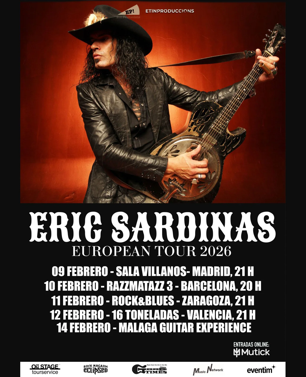 Cinco oportunidades para comprobar por qué Eric Sardinas sigue siendo uno de los nombres más explosivos del blues-rock contemporáneo en directo. Una gira corta, intensa y pensada para vivirla a pocos metros del escenario, con las cuerdas ardiendo y el volumen al máximo.