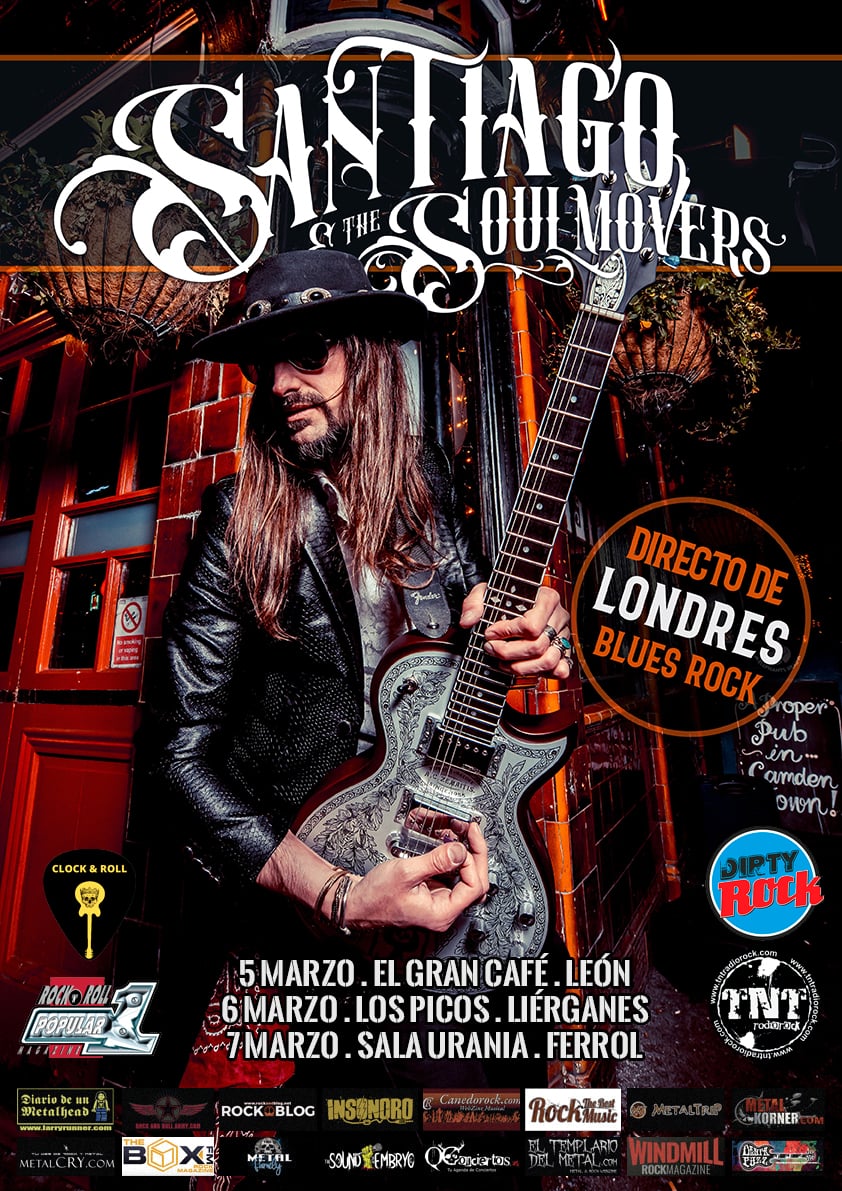 En 2021 inició una nueva etapa creativa dando como resultado es un material aún inédito bajo el nombre de “Santiago & The Soulmovers”, donde el blues rock eléctrico se fusiona con el soul y sutiles vibras de Nashville, aportando frescura sin perder la crudeza de las raíces. Lejos de quedarse en la nostalgia, la banda ha logrado convertir las influencias de bandas legendarias en combustible para un directo vibrante y actual. Junto a Santiago les acompañan Juan Gasco a la batería y Robin Thunders al bajo. La gira española será una oportunidad perfecta para comprobar en las distancias cortas incendiarios riffs de guitarra, solos con alma y el balanceo rítmico desde las primeras notas. Apunta bien las fechas!!!