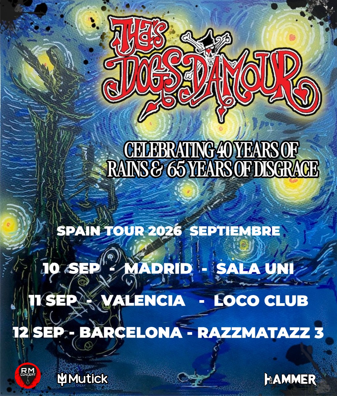 Dentro de un marco conceptual, esta gira se ha bautizado como “40 Years Of Rains, 65 Years Of Disgrace”. En la cual Tyla manifiesta una declaración de principios tan irónica como honesta, marca de la casa. Con una base de seguidores fieles e intergeneracional, Tyla’s Dogs D’Amour siguen demostrando que el rock también puede ser poesía. Que la crudeza puede convivir con la belleza y que algunas canciones envejecen como el buen alcohol, resudando intensidad y veracidad. Los amantes del rock’n’roll bohemio y corazón callejero están de enhorabuena. Tyla’s Dogs D’Amour regresan a los escenarios durante el mes de Septiembre con una gira que promete ser pura poesía eléctrica, whisky derramado y romanticismo canalla. Nos vemos en la carretera.