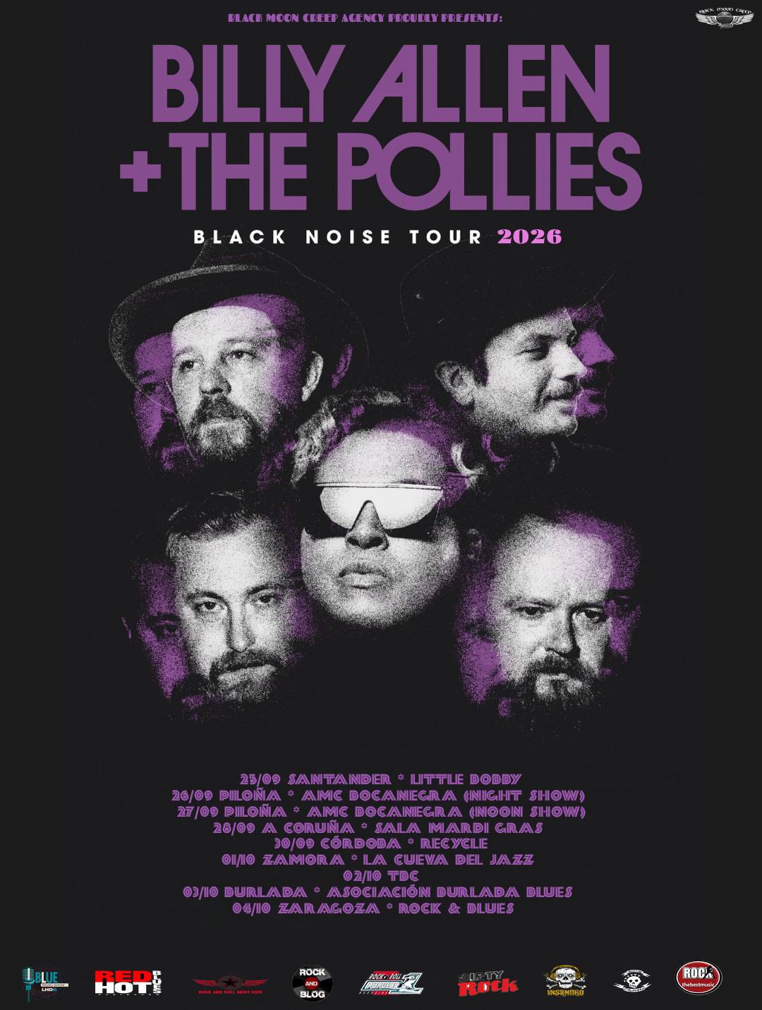 Billy Allen + The Pollies aterriza en España durante los últimos días del mes de Septiembre e inaugurando Octubre para presentar su disco debut Black Noise” publicado en 2025. En este primer trabajo el quinteto estadounidense ha obtenido un gran logro y  resalta por tener una gran energía sureña gracias a la diversificación de diferentes estilos. La banda nace de la fusión entre el carismático Billy Allen y el cuarteto de Alabama The Pollies, una unión que, aunque gestada años atrás en un encuentro casual, no se consolidó hasta coincidir en los míticos estudios FAME Studios. Allí surgió una conexión musical inmediata junto a Jay Burgess, que acabaría dando forma a este proyecto común. “Black Noise” es un álbum que da la espalda a etiquetas.