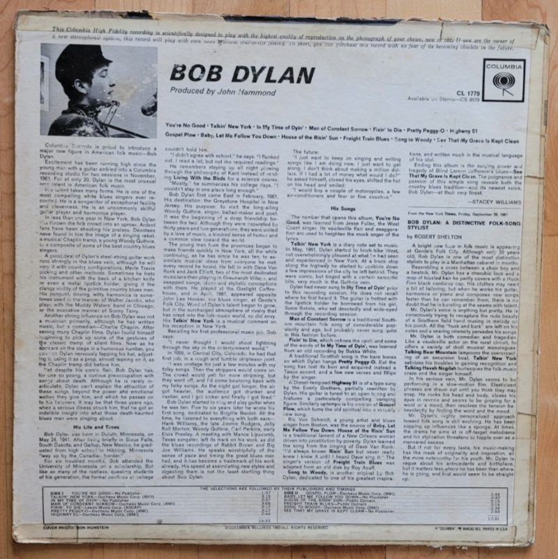 El primer álbum de Bob Dylan suele pasar desapercibido porque la mayoría de las canciones son de otros artistas (Blind Lemon Jefferson, Bob Dylan, Bukka White, Curtis Jones, Jesse Fuller, John H. Hammond, John Lair). Lanzado un 19 de marzo de 1962, producido por John H. Hammond, fue grabado en apenas tres sesiones entre los días 20 y 22 de noviembre de 1961, un año después de que Dylan llegara a Nueva York y comenzase a ofrecer conciertos en clubes y bares del Greenwich Village.