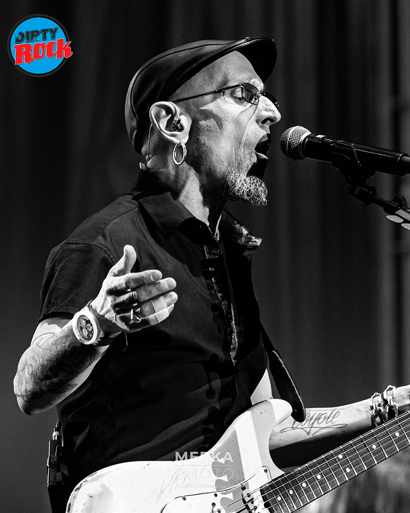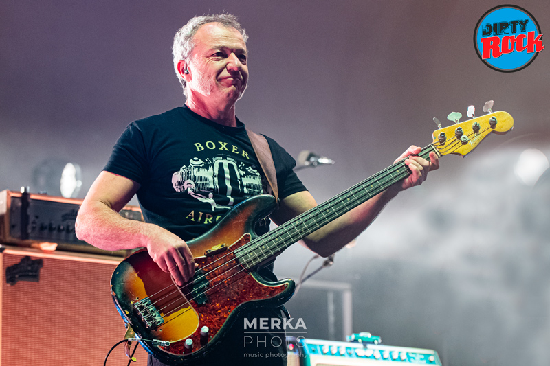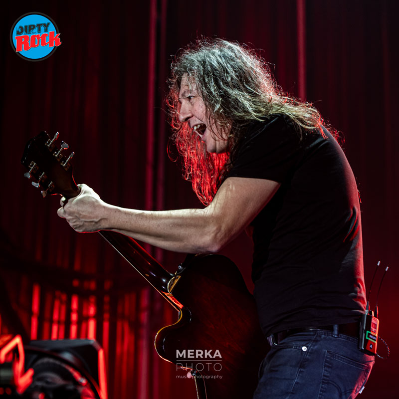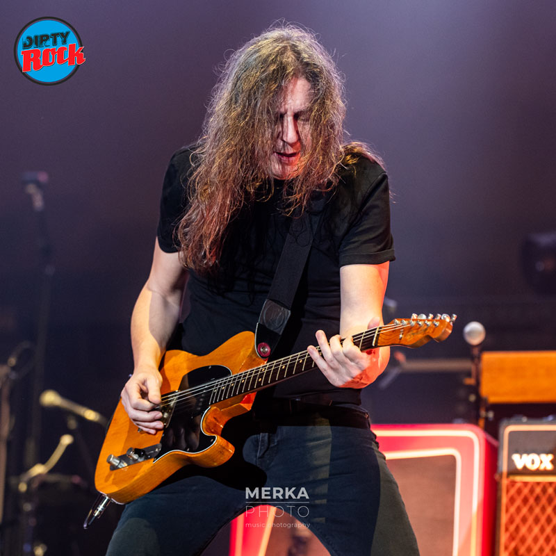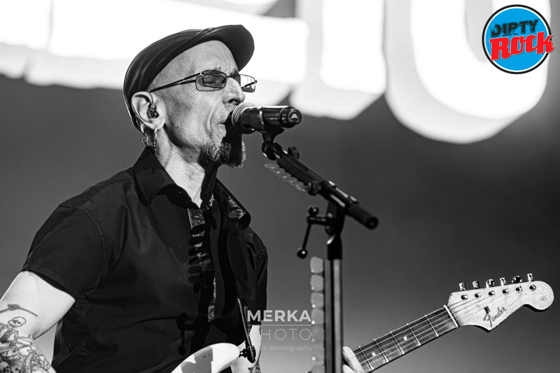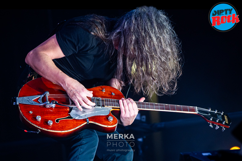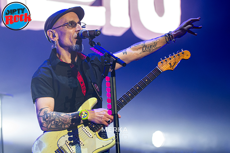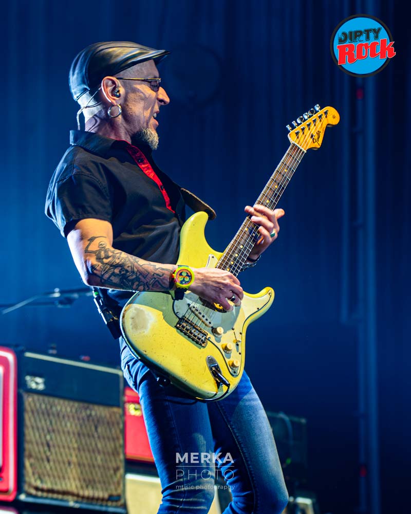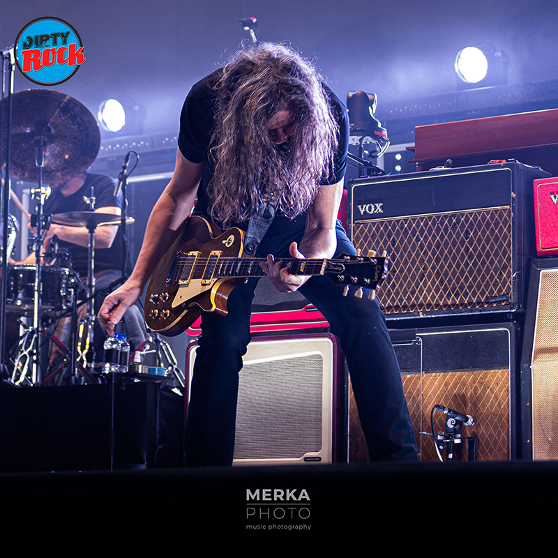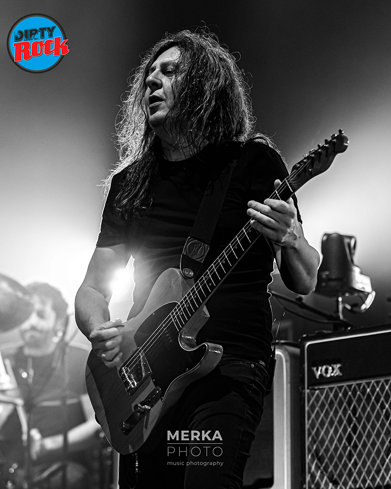 “Los cuervos se lo pasan bien” muy guitarrera con un Carlos Raya, otro de los pilares de la banda, que nos mostró su arsenal de guitarras, Les Paul, Telecaster, Gretsch o Statocaster entre otras, a las que le da el tono adecuado con riffs quirúrgicos como virtuoso,  de lo mejorcito del panorama estatal. “Entre la espada y la pared”  y ya iban en automático, “A quemarropa” disfrutando del buen sonido desde cualquier parte del recinto, acompañado de tres pantallas que apostillaban detalles, “El monte de los aullidos” tema más intimista pero con los mismos mimbres de las canciones de Fito, letras en la cualquier mortal se puede identificar.  “Volverá el espanto” como alegato contra las malditas guerras con imágenes subliminales de muerte y destrucción.
