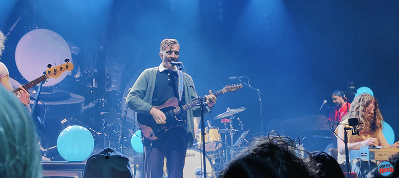 Cuando Childers sale al escenario, vistiendo un pantalón de vestir color vino oscuro con raya diplomática, polo azul oscuro con cuello blanco y una rebeca de lana verde, en apariencia, te lo podrías fácilmente imaginar sentado en los primeros bancos de madera de una vieja iglesia mientras escucha en silencio el sermón del domingo a media tarde. Camina con paso despreocupado, parece desubicado, como el tipo que anda en medio de su sala de estar y no consigue encontrar un libro en medio de los acordes de la banda. Agarra el micrófono y comienzo a escupir las letras del primer tema, Eatin’ big time, y es entonces cuando vemos como su energía va transformando el lugar, y el público ya se ha transformado en un coro unísono que inunda la Pleyel de París. Esto acababa de empezar y la sala era una olla a presión.