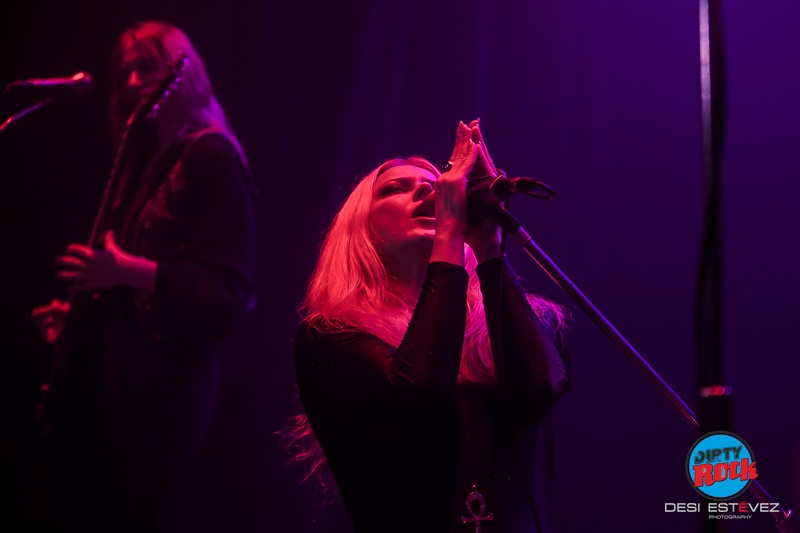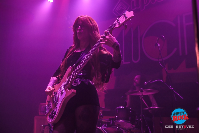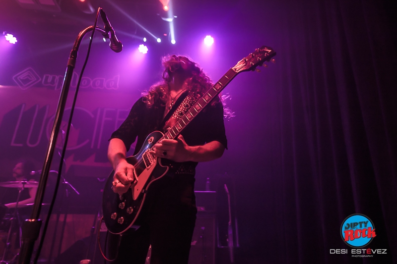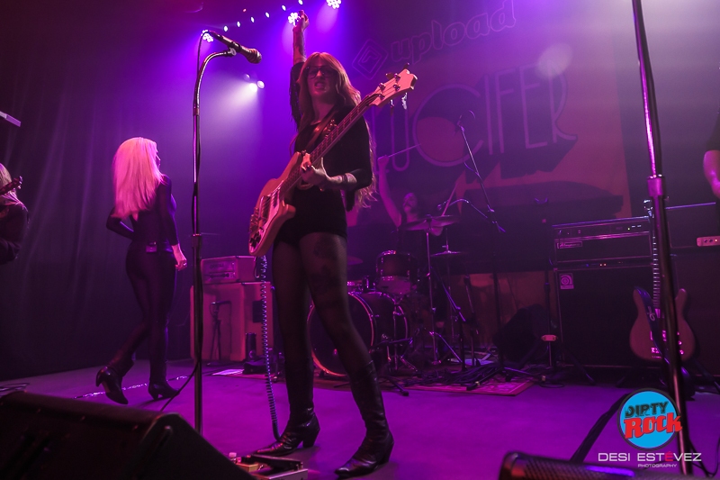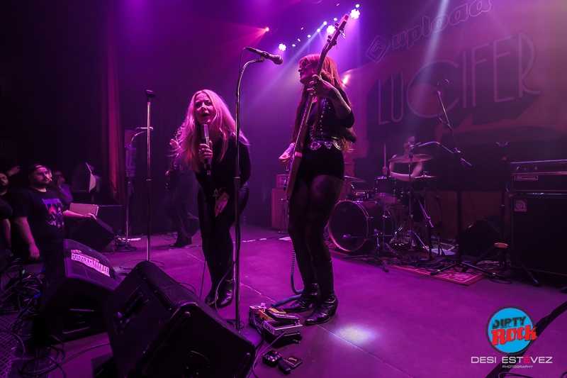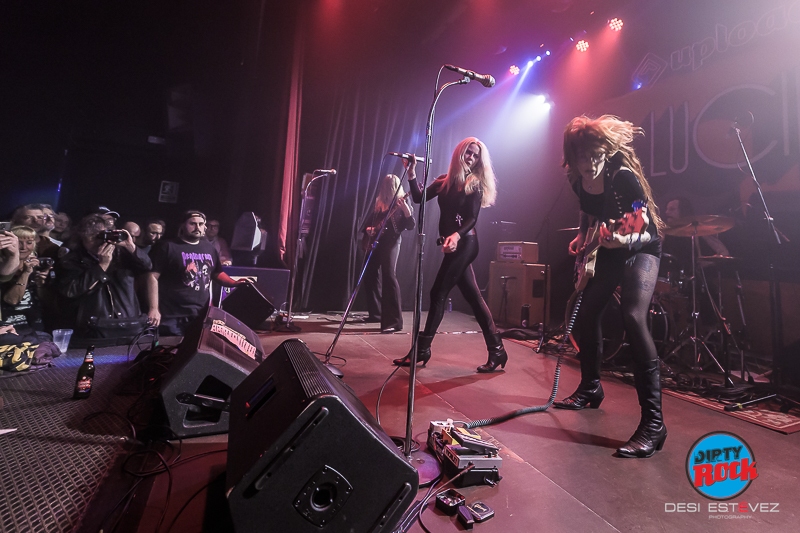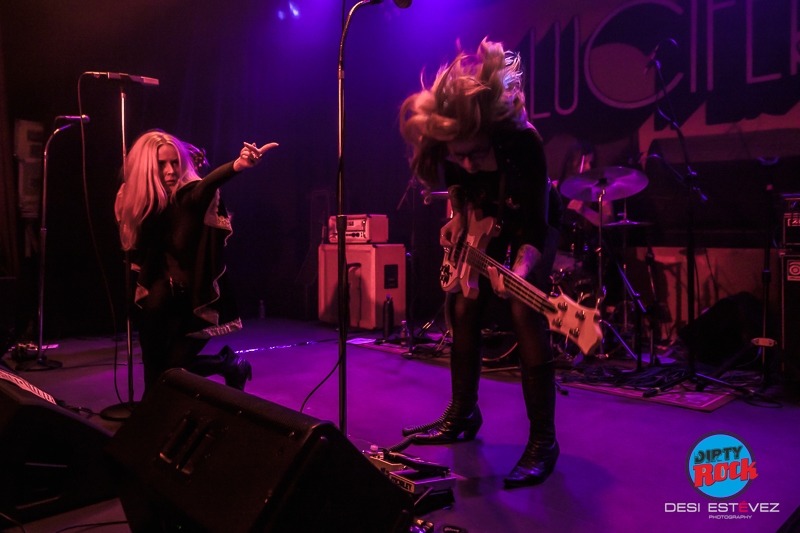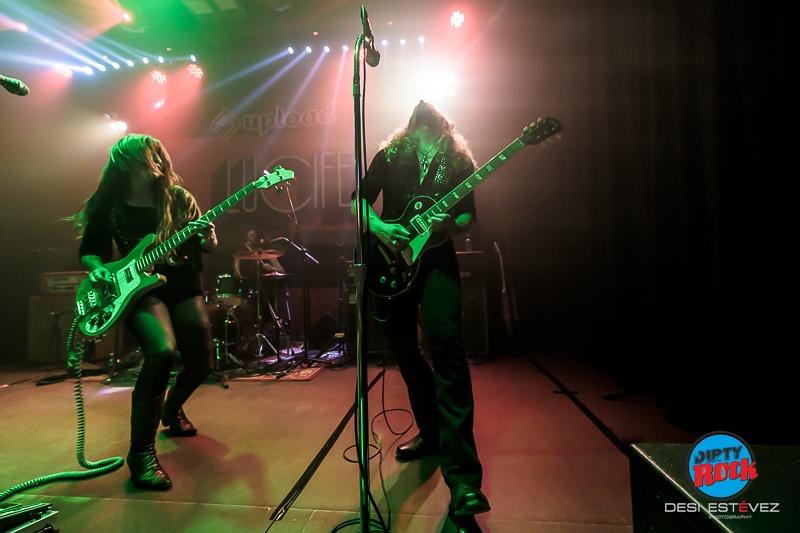 Tras la irrupción de los músicos, la estrella de la formación, Johanna Sadonis, aparece rotunda como una carroza funeraria fabricada con diamantes; viste negro riguroso y, en el centro, un luminoso colgante desprende brillos aulladores como los colmillos de un arcano vampiro egipcio: el símbolo de Anubis ( el mismo que porta Claudia en la espalda de su chaqueta y en el cordón de su bajo). La banda acomete un tema ‘ ad hoc’: el single de debut que, en 2015, lanzarían a través del mítico sello Rise Above (hogar del mejor occult rock internacional). “Anubis”, con su magia ominosa que describe el inframundo esotérico, constituye uno de los grandes leitmotivs de la banda; el más allá de las momias, la Cinópolis de la gran deidad antropomórfica funeraria…. ¡ Y es tal impacto de las fuerzas combinadas de la banda y Johanna, que toda la sala ruge de placer! En pocos instantes, cuando llega el estribillo “cuál es el demonio que está en mi interior”, Lucifer ya ha conquistado al público que abarrota la Upload.