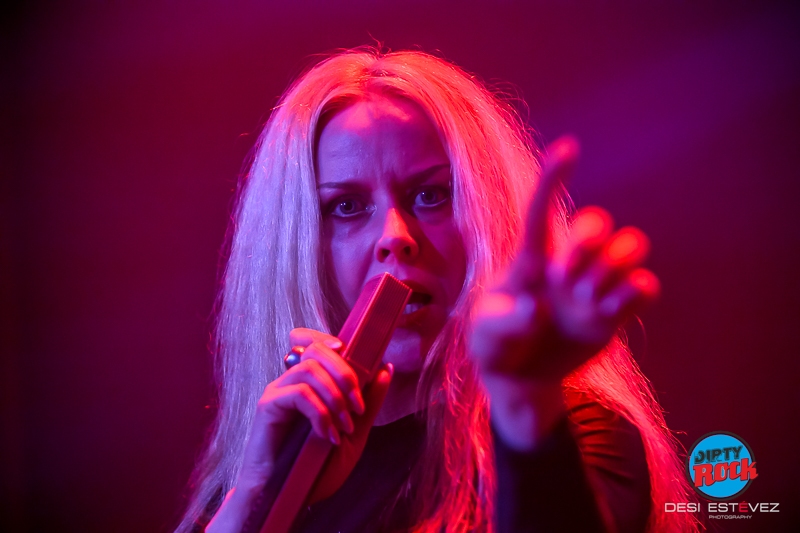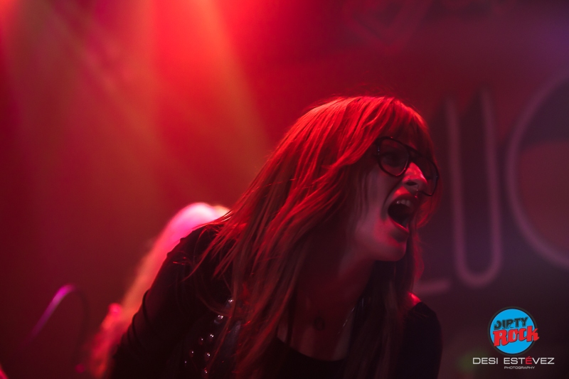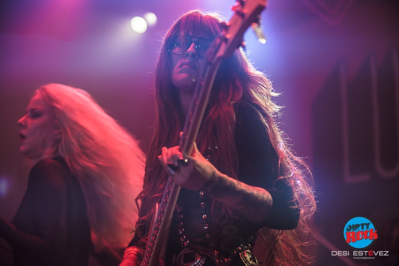 Pero en nuestras quinielas había un firme candidato. Cuando en medio de la neblina roja -que me recordó al inmenso océano de sangre del reciente film “Iron Lung”-de la luminotecnia de la sala vimos desfilar a la formación, descubrimos en primer lugar al batería alemán Kevin Khun (recientemente incorporado), que acometió los primeros compases de lo que sería una actuación solvente; a la guitarrista Coralie Baier a continuación; a la pletórica Claudia Haze bajista (con minifalda y chaqueta alusiva a la iconografía de la banda) y, por fin…al guitarra sustituto: el virtuoso músico suizo Max Eriksson, de la banda Mothercrow.